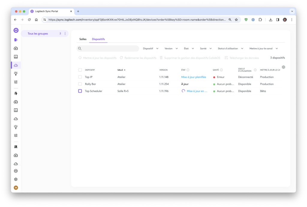 La console Logitech Sync ( https://sync.logitech.com/ ) est complémentaire de celle de Google, elle va notamment vous permettre de voir le statut d’autres appareils comme le Tap Scheduler, l’écran qui s’installe à l’entrée de vos salles de réunion.