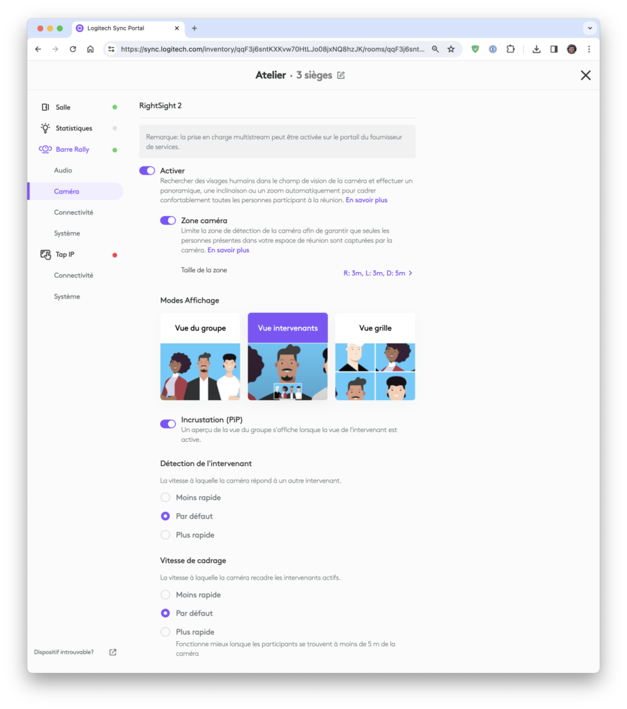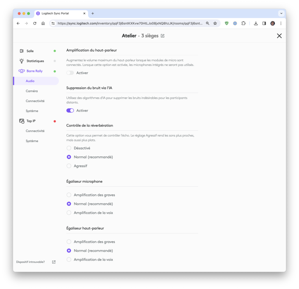 Elle permet aussi des réglages plus avancés des équipements, par exemple l’audio et la caméra de chaque barre mais aussi piloter les mises à jour: