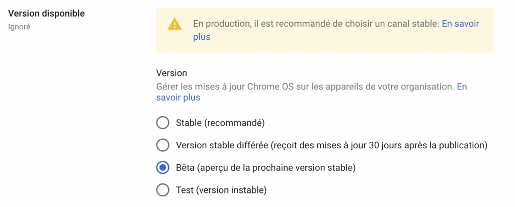 Donc par exemple quand vous choisissez la version “Stable” ce qui est le réglage par défaut, à date de cet article, vous êtes sur Chrome OS M96. Alors que la version de Chrome OS déployée sur les ordinateurs comme les Chromebooks est la 110. A noter, il n’est pas possible de changer la version déployée à la racine de votre organisation Google Workspace. Lire la doc dédiée ici.
