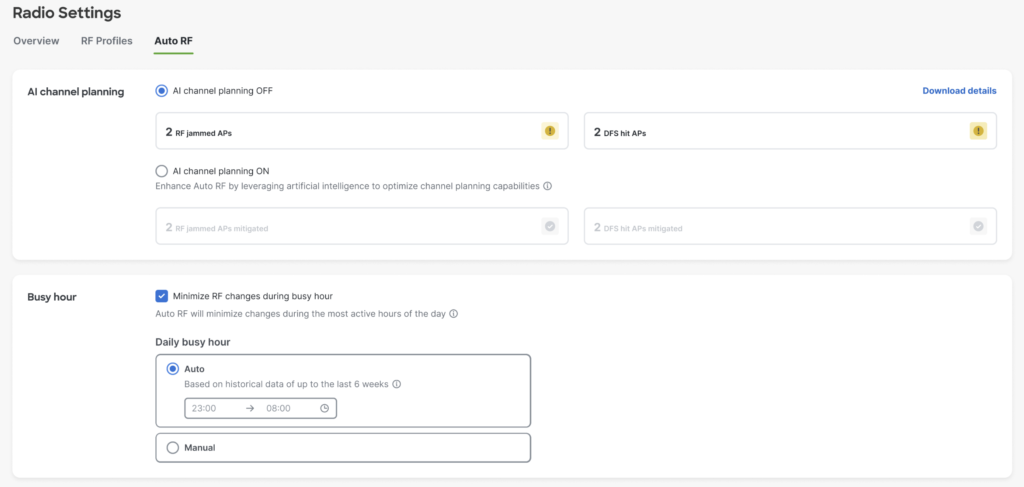 Petite note: le fonctionnement d’Auto RF basé sur l’AI est optimisé pour les “networks” Meraki qui sont répartis par localisation physique, comme le principe de “busy hour” est relatif à une heure définie dans le tableau de bord.